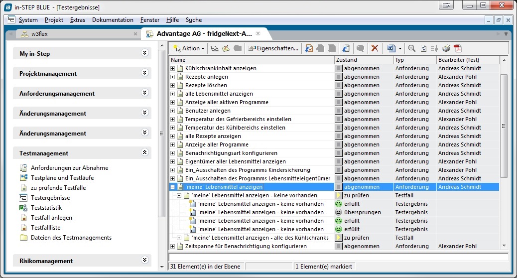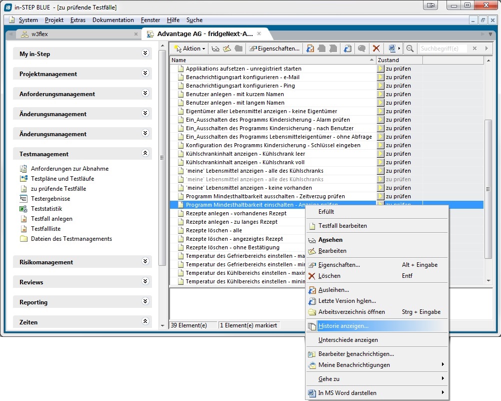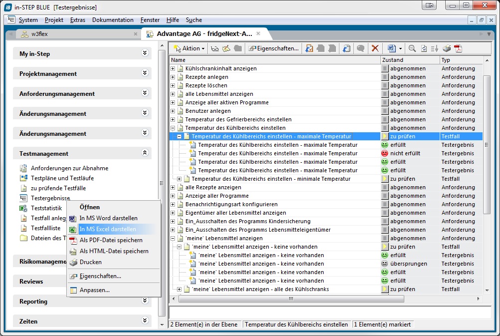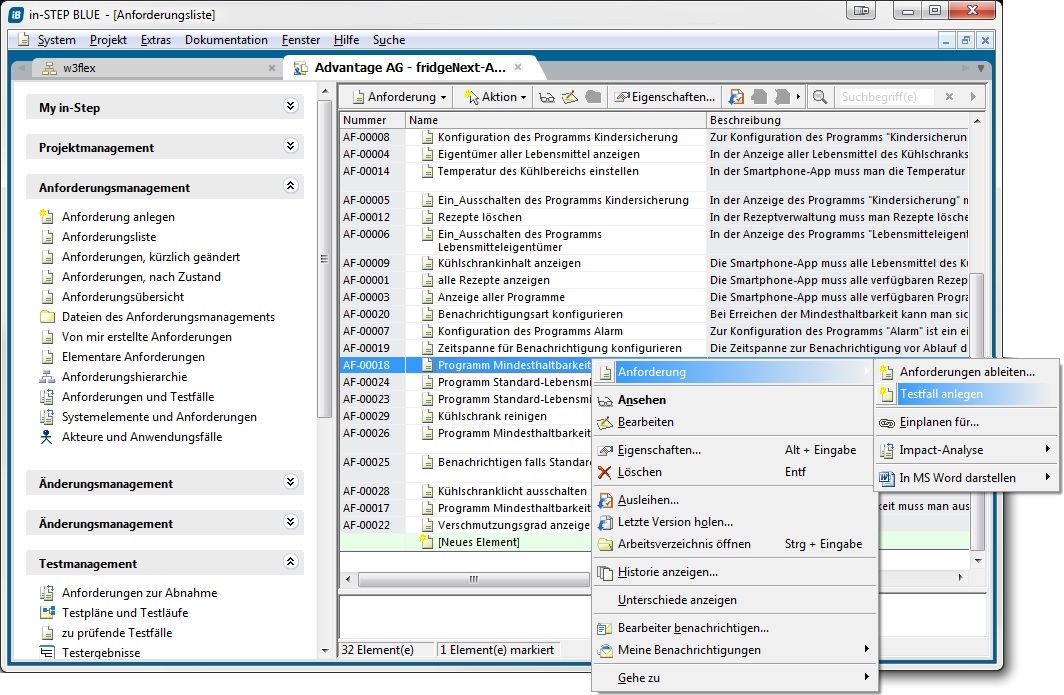 in-STEP BLUE bietet Ihnen ein System, in dem Sie sämtliche Informationen für Ihre Entwicklung oder Ihre Projekte verwalten können. Und diese Elemente haben Beziehungen zu anderen Elementen. Bspw. prüfen Sie mit Testfällen die Realisierung von Anforderungen. Und daher können Sie auch Testfälle direkt für Anforderungen erzeugen.