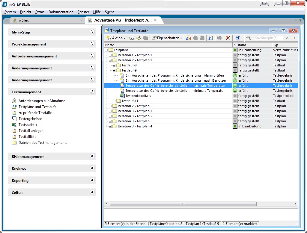 Welchen Prozess und welche Ablage Sie in in-STEP BLUE hinterlegen, können Sie definieren. Hier sehen Sie eine Struktur mit Testplänen, Iterationen und Testläufen in den Iterationen, mit entsprechenden Testergebnissen und einem Testprotokoll.