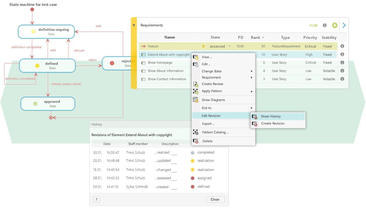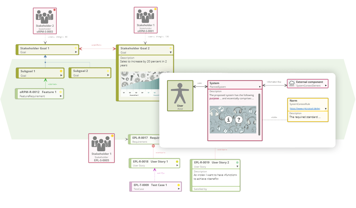 Ideas, goals, and requirements are recorded, organized, and prioritized. In-depth stakeholder analyses provide a comprehensive understanding of the framework conditions and expectations. Goal and context diagrams offer guidance. Customizable forms support consistent and efficient content recording and management. With a single click, you can generate Word or PDF documentations.