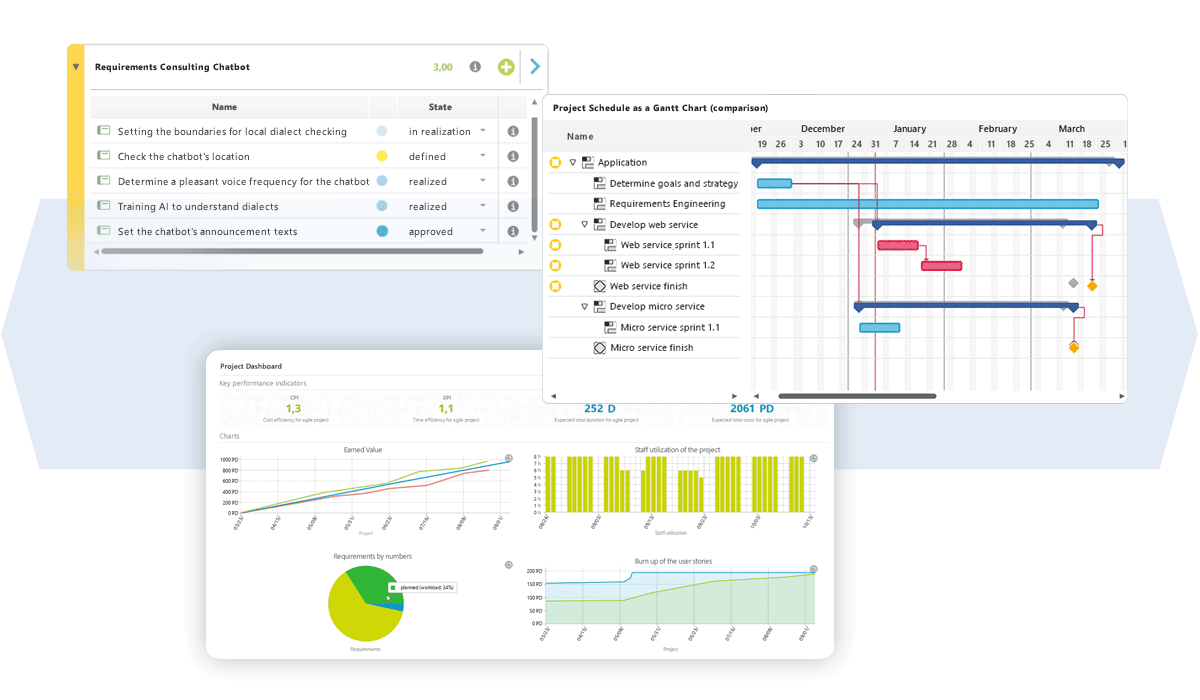 objectiF RPM supports both classic project plans with Gantt charts and agile backlogs, boards, and metrics — and even both together. If your team works in a hybrid manner, you can combine the methods flexibly according to your needs.