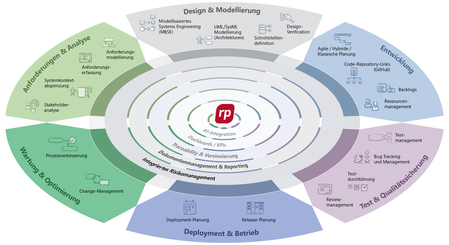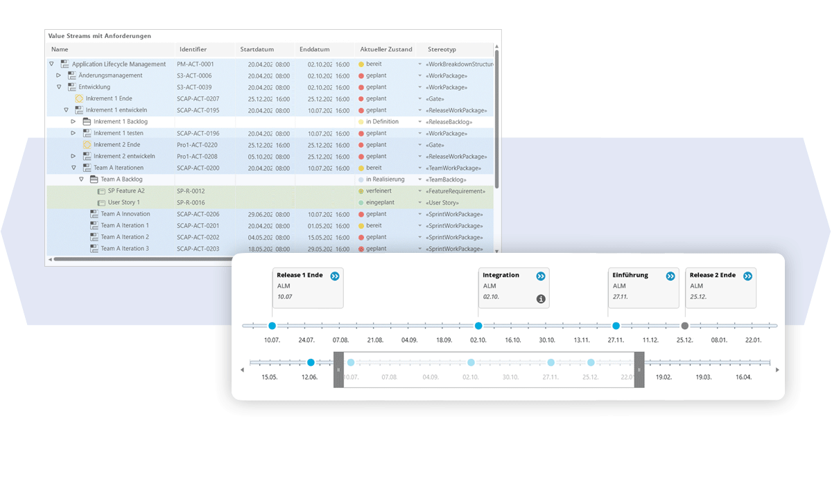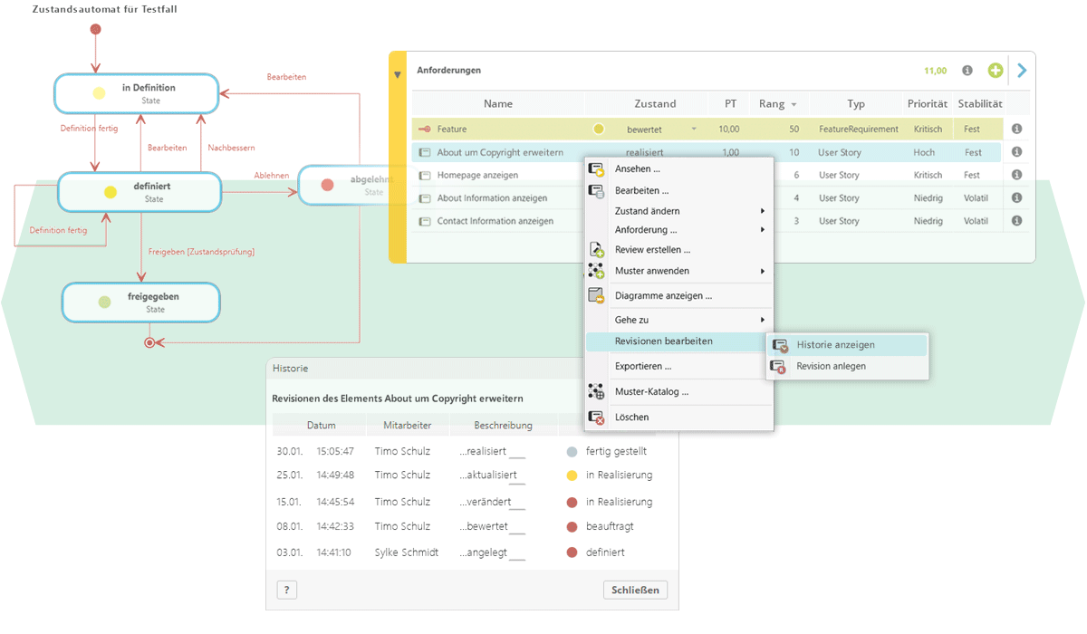 Durchgängige Traceability und Versionierung sorgen dafür, dass Änderungen nachvollziehbar bleiben und Zusammenhänge zwischen Anforderungen, Artefakten und Entscheidungen transparent sind.