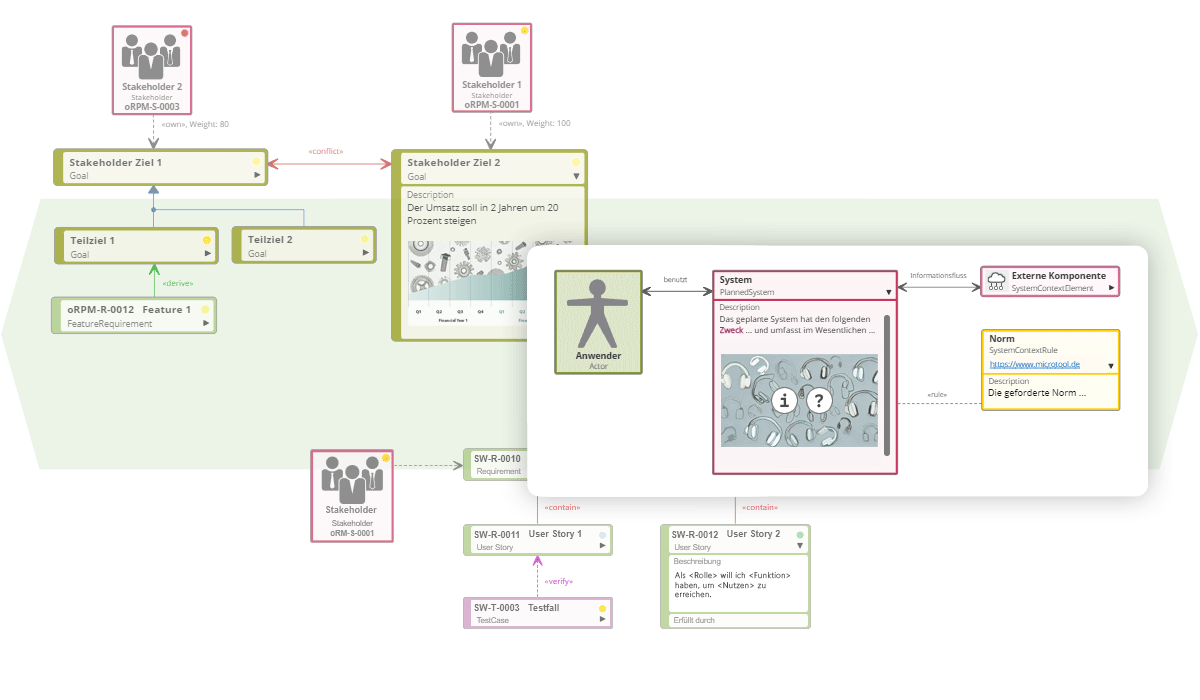 Ideen, Ziele und Anforderungen werden erfasst, strukturiert und priorisiert. Fundierte Stakeholderanalysen schaffen ein umfassendes Verständnis der Rahmenbedingungen und Erwartungen. Ziel- und Kontextdiagramme schaffen Orientierung. Anpassbare Formulare unterstützen eine konsistente und effiziente Erfassung und Verwaltung der Inhalte. Die Dokumentation können Sie per Klick als Word- oder PDF-Datei erstellen.