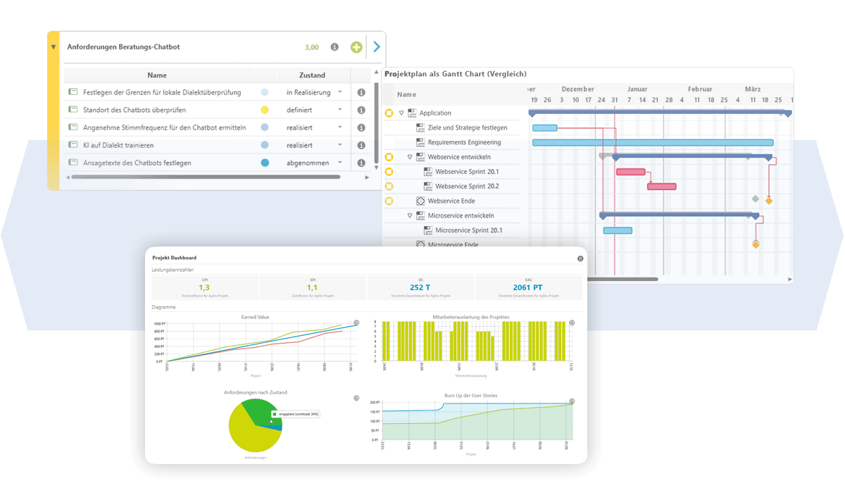 Ergänzt wird dies durch Dashboards und KPIs, die den Projektstatus auf einen Blick sichtbar machen und fundierte Entscheidungen auf allen Ebenen ermöglichen.