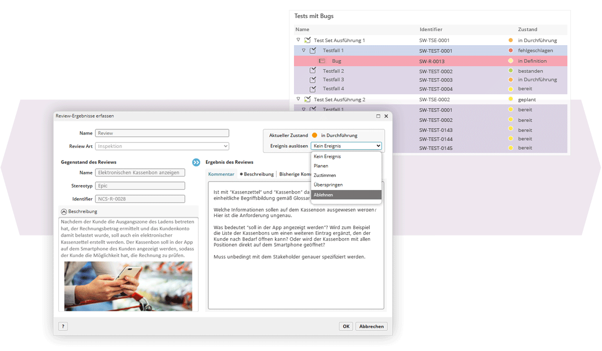 Die Qualitätssicherung ist ein integraler Bestandteil des Lebenszyklus. Sie legen fest, für welche Elemente Review- und Freigabeprozesse durchgeführt werden sollen. Im Rahmen der Qualitätssicherung definieren Sie außerdem Testfälle, erzeugen Testpläne und planen sowie dokumentieren Testdurchführungen. So bleibt die Qualität des Projekts nachvollziehbar, konsistent und revisionssicher.